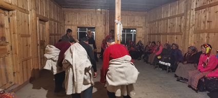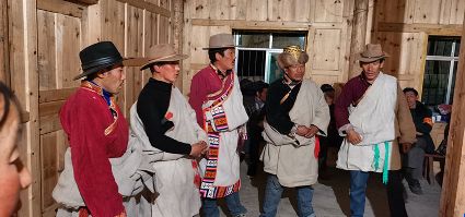 夜臨了,月低垂,整條山谷陷入了藍(lán)色的世界,近處是墨綠,遠(yuǎn)處是淡綠,雄渾的大山在綠的撫摸下也變得婀娜起來;古老寨子的火塘也燃起來了,勞作了一天的普米人聚在一起,跳起了原始氏族人群圍火而舞的傳統(tǒng)舞蹈,曲調(diào)悠揚(yáng)且古樸動(dòng)人。