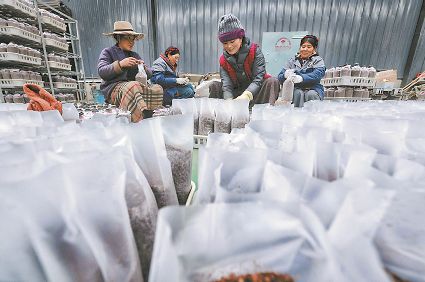 2021年新年伊始,甘孜州的氣溫已經降到了零攝氏度以下。1月5日,位于雅江縣八角樓鄉(xiāng)松茸村的松茸產業(yè)園菌種菌包廠房里卻是熱氣蒸騰,數十位工人正有條不紊地往菌種架上放置菌包。很快,3米多高的鐵架上就密密匝匝的堆滿了制作好的菌包。廠房的旁邊就是食用菌存儲冷庫,各類食用菌在這里進行分揀、定級、包裝。十多個小時后,經物流車送出的一箱箱食用菌產品就會出現在省內外各大超市的生鮮貨架上,市民在千里之外也能嘗到大山里的味道。