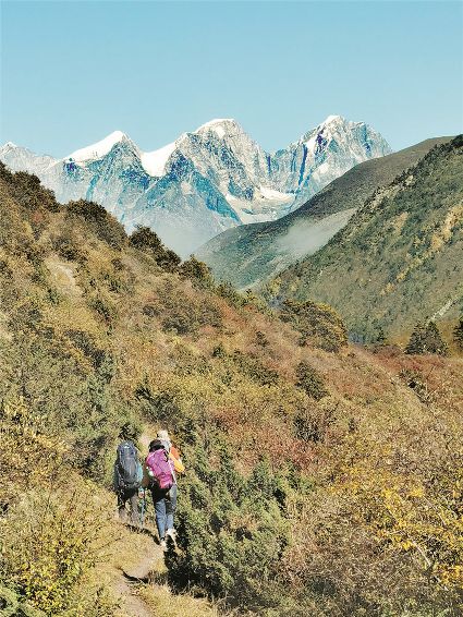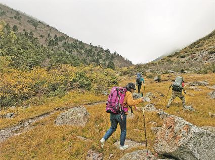 一般徒步線路需要三天完成,第一天從康定折多塘開始徒步,進(jìn)入毛家溝后一路緩上坡經(jīng)過美麗的荒野,下午就可以到達(dá)蘭尼巴埡口扎營。第二天上到山脊觀貢嘎主峰以及衛(wèi)峰小貢嘎、嘉子峰、愛德嘉峰、日烏且峰、勒多曼因,還能看到雅拉雪山和美麗的云海金山。第三天原路返回,或經(jīng)木雅圣地去新都橋或翻過埡口去甲根壩,最推薦的是從蘭尼巴山脊繼續(xù)前行到達(dá)恩支漫希湖,沿雅哈埡口、桑恩措、冷嘎措、泉華灘、木居海、里索海、子梅村、貢嘎寺、巴王海,連接貢嘎穿越線,沿途的風(fēng)光更加動人。