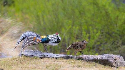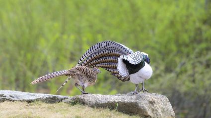 4月16日,筆者在康定市雅拉鄉(xiāng)境內(nèi),再次拍攝到國(guó)家二級(jí)保護(hù)動(dòng)物白腹錦雞求偶的清晰視頻。一只色彩斑斕的雄鳥,拖著黑白相間的云狀斑紋尾羽,圍著雌鳥跳起了“圓舞曲”。整個(gè)求偶過程有十多分鐘。每年三至五月是白腹錦雞求偶期。