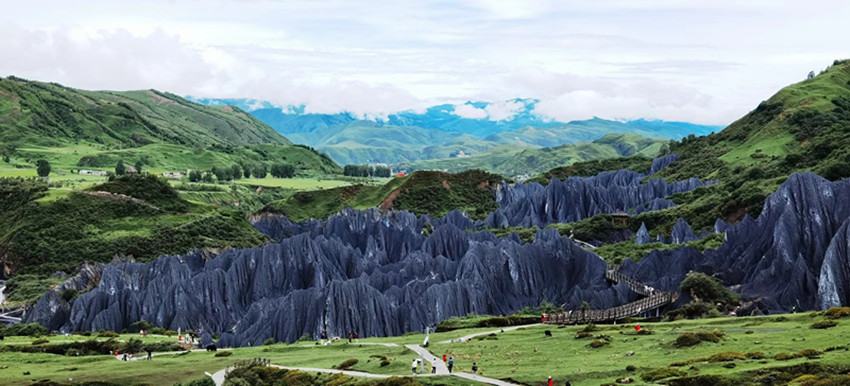 眺望石林恰如墨染,一條靈動的飄帶穿溝渡嶺,蜿蜒于碧草野花之間。沿新修的步道,緩慢步入其中,才能真正感受到石林如同一片異世界。