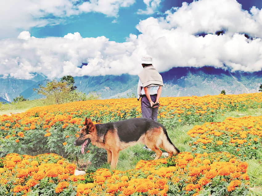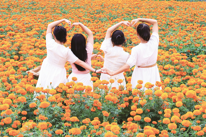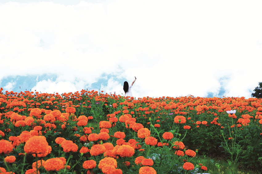在這金風(fēng)送爽的秋日,瀘定德威加郡海子村18萬(wàn)株萬(wàn)壽菊競(jìng)相綻放,漫步在花海之中,人們可以感受秋風(fēng)的輕撫,呼吸清新的空氣,寧?kù)o的村寨依托著貢嘎雪山、藍(lán)天白云,在成片的萬(wàn)壽菊裝點(diǎn)下構(gòu)成了一幅亮麗的鄉(xiāng)村畫(huà)卷。