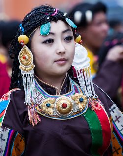 藏裝的基本特點是長袖、寬腰、大襟、肥大。直線寬邊,色彩對比強烈。男女藏袍均習慣以粗紡厚毛呢為料,左襟大,右襟小,一般在右腋下釘一個紐扣,或是用紅、藍、綠、雪青等色布做兩條飄帶,穿時結(jié)上。男式藏袍多為黑、白兩色,領(lǐng)圍、袖口、衣襟和底邊,鑲上色布或綢子底邊,古樸渾厚。夏天或勞動時,一般只穿左袖,右袖從后面拉到胸前搭在左肩上,也可左右袖均不穿,兩袖束在腰間,古銅色的皮膚袒露于外,雄風凜凜,彪悍剛健。女式藏袍,分有袖和無袖的兩種,夏秋兩季的藏袍無袖。里面多襯有紅、綠等色彩鮮艷的襯衣,襯衣翻領(lǐng)在外,衣袖要長于胳膊一至二倍,長出部分,平時卷起,舞蹈時放下,舒展飄逸,瀟灑自如。藏族的帽子式樣繁多,各地均有不同,拉薩等地以金寶頂帽為最多,用金絲或銀絲繡織圖案,在陽光照耀下,閃閃發(fā)光。金花帽是男女老幼都喜歡戴的民族帽。男女穿的藏靴,底高二寸,靴腰高至小腿以上,靴面用紅綠相間的毛呢裝飾,繡有圖案花紋。靴頭向上隆起。藏族男女喜歡佩飾。耳穿大環(huán),手腕金銀,頂戴珠鏈,尤其是在腰間,男挎長劍,女佩腰刀,更顯得粗獷彪美。