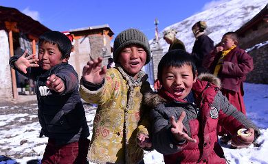 7、甘孜縣城郊雪山下的也哈村。雪后初睛,村里的孩子們在村中的廣場上嬉戲。