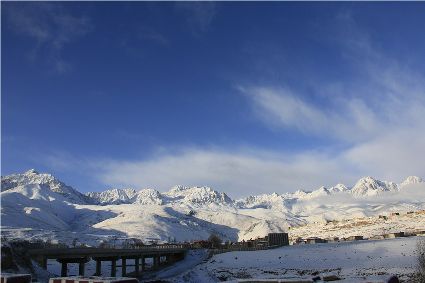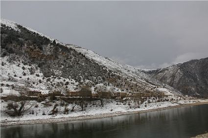 在接下來的路途中,停車休息的瞬間,一個臨水的村莊出現(xiàn)了。經(jīng)過昨夜的一場大雪,整個村子出人意料的“安靜”,河對岸牧民放馬的聲音,那個到河邊放下水桶汲水的女人取水的動靜,似乎都被一場雪過濾了。我即使走到河邊,也難以通過耳朵和眼睛接近這一切。一幅無聲的畫面更貼近一場雪。我放下手中的相機,似乎也在放下一些多余的東西,尊重著一種留白。