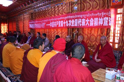 宣講團(tuán)成員勇勇用藏語激情洋溢的宣講黨的十九大精神,現(xiàn)場(chǎng)不斷響起熱烈的掌聲。當(dāng)勇勇講到我國(guó)五年來取得的輝煌成就時(shí),僧人們都激動(dòng)不已,紛紛為發(fā)展成就點(diǎn)贊?!奥犃私裉斓男v,我進(jìn)一步了解到了我們國(guó)家這些年來取得的發(fā)展成就。一直以來,黨對(duì)我們的關(guān)懷是看得見摸得著的,現(xiàn)在我們的寺廟管理越來越規(guī)范,基礎(chǔ)設(shè)施也得到了完善,通往寺廟的道路也有了明顯改善,我們的生活越來越好了,這一切都是共產(chǎn)黨的功勞?!彼聫R僧人尺乃表達(dá)著對(duì)黨的感恩。