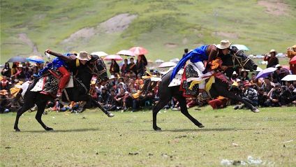 7月23日,四川甘孜藏族自治州理塘縣村戈鄉(xiāng)賽馬活動(dòng)開(kāi)始,牧民們?cè)隈R背上一顯身手。每年藏歷六月,當(dāng)草原上格?;ㄊ㈤_(kāi)的時(shí)候,四川省理塘縣24個(gè)鄉(xiāng)(鎮(zhèn))就會(huì)按照習(xí)俗舉辦隆重的賽馬會(huì)來(lái)拜祭神山,慶祝豐收。迄今有400多年歷史的賽馬分為耐力賽、小走賽、馬術(shù)賽等,其中最為精彩的是馬術(shù)賽:馬肚藏身、馬背倒立、飛騎射擊、拾哈達(dá)等,驚險(xiǎn)刺激。2008年6月,此項(xiàng)活動(dòng)被列入四川省級(jí)非物質(zhì)文化遺產(chǎn)保護(hù)項(xiàng)目。(朱虹 葉強(qiáng)平)