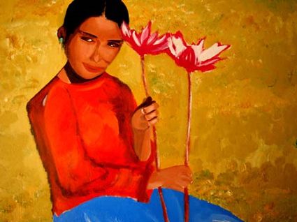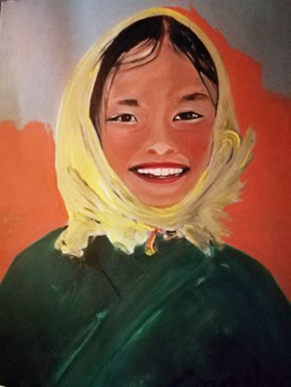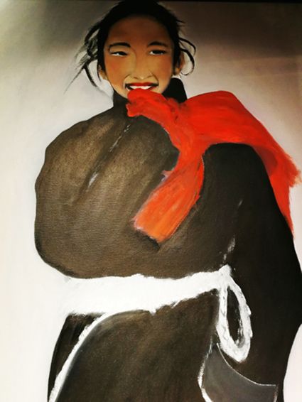 畫畫三年多了。十三歲寫詩;到了高原后,方開始創(chuàng)作長篇小說。在上海,我做過畫廊。但要說斗膽動筆畫幅肖像。我是在白度母唐卡前燃了三炷香的。包括在咖啡店現(xiàn)場作畫。到京城繼而國外辦畫展,我認為都是因了我把畫布當(dāng)成了詩稿的緣故。于是,大家喜歡我這種野路子,天馬行空,可又不舍方圓的創(chuàng)作手法。接下來,歐洲、東京還會有我的系列展覽。