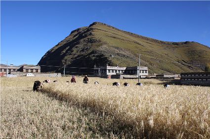 國慶期間,在稻城縣傍河鄉(xiāng)和省母鄉(xiāng),沉甸甸的青稞穗隨風起伏、頻頻頷首,把喜悅之情傳給這塊土地的主人。