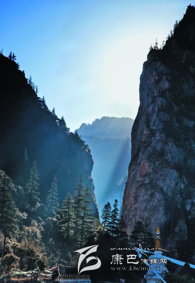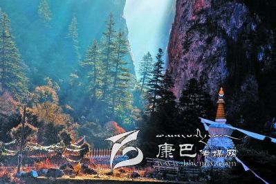 進(jìn)得溝來(lái),卻又是另一番景致。溪水在窄細(xì)的深谷中忽隱忽現(xiàn),水聲叮咚,時(shí)而從碎石卵灘下潛淌,時(shí)而冒出雪花樣的身影,不張揚(yáng),含靦腆,與兩邊千仞峭崖的兇猛樣恰成強(qiáng)烈對(duì)比。此時(shí)容不得你不抬頭望山,望天了。極盡險(xiǎn)峻的峭壁奇峰,危巖巨石,陰面如潑了墨暈,陽(yáng)面露了慘白,硬硬地把個(gè)溝谷擠成了“一線天”,駭?shù)谜锪锏奶焐弦粌蓤F(tuán)亂云也不敢停歇片刻,欲飄走,卻又被錯(cuò)落參差的山峰撕得七零八落。更有那墨黑如黛的松柏齊齊地排隊(duì)豎立在危崖峭壁間,或一兩階,或三四階,如挎刀武士護(hù)著峭崖,又如黑大漢長(zhǎng)的亂糟糟的絡(luò)腮胡,徒增添了猙獰之貌。傳說(shuō)皮察溝內(nèi)有座黑教的神山——呷拉神山,每到“朝山會(huì)”,農(nóng)牧民前去神山朝拜。然而,呷拉山頂不知何時(shí)棲居了一只碩大的“夏甲曲絨”(意為一種兇惡的鳥(niǎo)),不時(shí)將村里百姓的牛、羊叼到山頂吞食。藏王格薩爾得知此事,決心要除掉“夏甲曲絨”。 “夏甲曲絨”得知格薩爾王大軍前來(lái)征服它,十分懼怕,數(shù)日藏于洞中不敢出來(lái)。格薩爾王隱身于巖石背后,讓王妃珠牡設(shè)法引“夏甲曲絨”出洞。“夏甲曲絨”形體碩大,棲息的洞無(wú)法掩其全身,頭部露在外面,時(shí)時(shí)觀察動(dòng)靜。珠牡到接近洞口的地方,滔滔不絕地贊譽(yù)“夏甲曲絨”長(zhǎng)得美麗,它禁不住贊美,漸漸地伸長(zhǎng)頭頸,最后驕傲地露出潔白的全身,并高昂著頭。格薩爾王趁機(jī)迅速?gòu)埞罴?,一箭射?ldquo;夏甲曲絨”的頸部,血流滿山,以后這座山便變成了紅山。當(dāng)“夏甲曲絨”負(fù)痛逃至皮察溝“一線天”時(shí)已精疲力竭,便停留在山崖中。格薩爾王隨即趕到,藏于灌叢,背靠巨石用腳一蹬(至今天一巨石呈凹形,似有人蹬過(guò)),再次射中“夏甲曲絨”。“夏甲曲絨”負(fù)痛逃去,停在覺(jué)然村一巨石上做垂死掙扎時(shí),它的爪爪在巨石一抓了無(wú)數(shù)道溝痕,后人把這個(gè)巨大石稱為“鬼抓石”……我無(wú)意去尋找“紅山”、“腳蹬石”、“鬼爪石”等,也沒(méi)想深究格薩爾除妖是否用過(guò)“美人誘惑計(jì)”,但卻在溝谷里發(fā)現(xiàn)一個(gè)與眾不同的現(xiàn)象:在一處窄小的谷地路傍,長(zhǎng)滿了雜枝黑蔓的灌叢,灌叢上彩幡密布,鉆進(jìn)灌叢,里邊竟然塑了一尊格薩爾王的神象,神象不高大,卻威儀,的確像是藏在崖壁下灌叢中……很容易讓人想到故事中的情節(jié)。