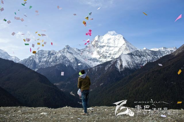 在車上,他很沉默,但當(dāng)車停靠在亞丁村口的觀景臺(tái)前時(shí),他下了車,從懷里掏出一大疊小紙片,揚(yáng)手撒出,神色虔誠(chéng)。