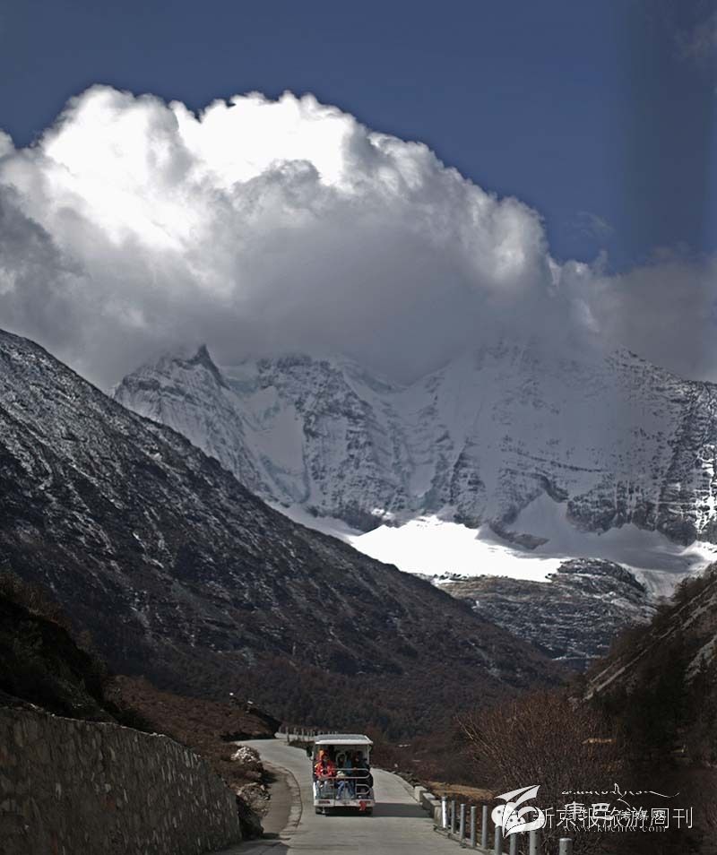 一輛電瓶車(chē)載著游客前往6032米的仙乃日雪山附近的觀景點(diǎn)。