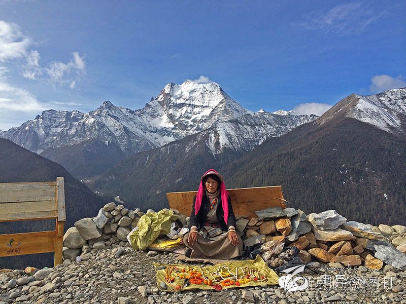 去往亞丁風(fēng)景區(qū)的路上,一位藏族婦女在觀景臺(tái)邊擺著地?cái)傎u(mài)當(dāng)?shù)厥罪椇吞禺a(chǎn)。![]()