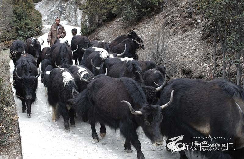 景區(qū)路上常有牧民趕著牦牛經(jīng)過(guò)。這里居住著很多藏族居民。![]()