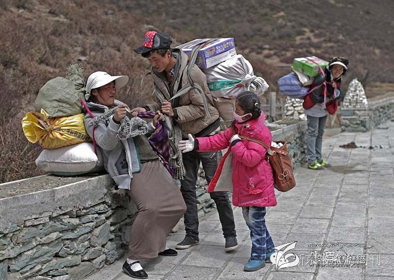 在海報(bào)4000多米的亞丁景區(qū),幾名當(dāng)?shù)鼐用癖持剡_(dá)百余斤物品走五公里往牛奶河居住地。通往洛絨牛場(chǎng)的山路。