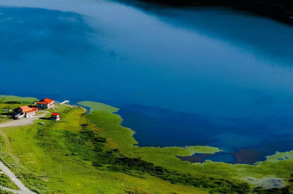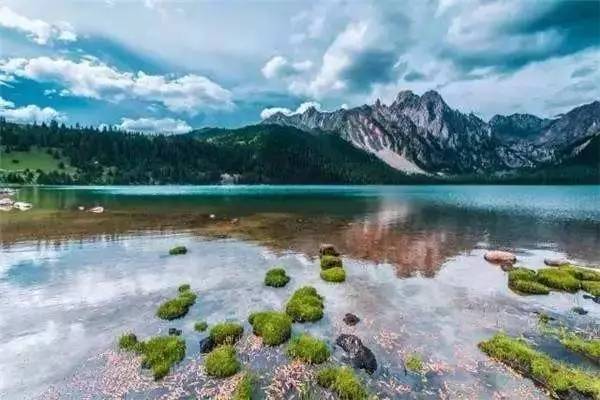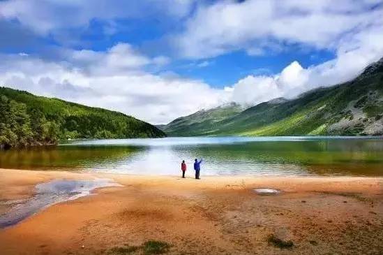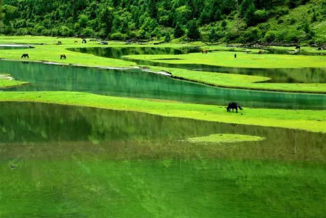 被原始森林和草甸環(huán)抱的五須海,當(dāng)?shù)厝擞鳛椤跋膳釆y的明鏡”,湖水碧綠透亮,將周圍的山水和天空全映照在湖面,幽靜的像一幅畫(huà)。從夏到秋周圍百花盛開(kāi),古樹(shù)盤根錯(cuò)節(jié)、藤枝攀沿纏繞,杜鵑樹(shù)伸向湖面,仿佛進(jìn)入原始古樸的仙境。