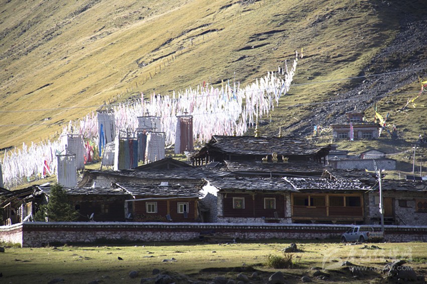 當(dāng)太陽落進(jìn)金龍雪山的懷抱,最后一抹余暉斜照在靜靜的莫斯卡村莊上。東邊的小河在斜陽里歡快的流過村莊,莫斯卡的女人在夕陽里,正領(lǐng)著孩子回家。西邊牧歸的男人悠閑的向山下趕著牦牛。村莊背后漫山的經(jīng)幡,在晚風(fēng)里誦經(jīng)祈?!袼_爾王的傳說就在這樣的時光里,雕琢成了漫山的石刻,在經(jīng)年的歲月里傳頌。