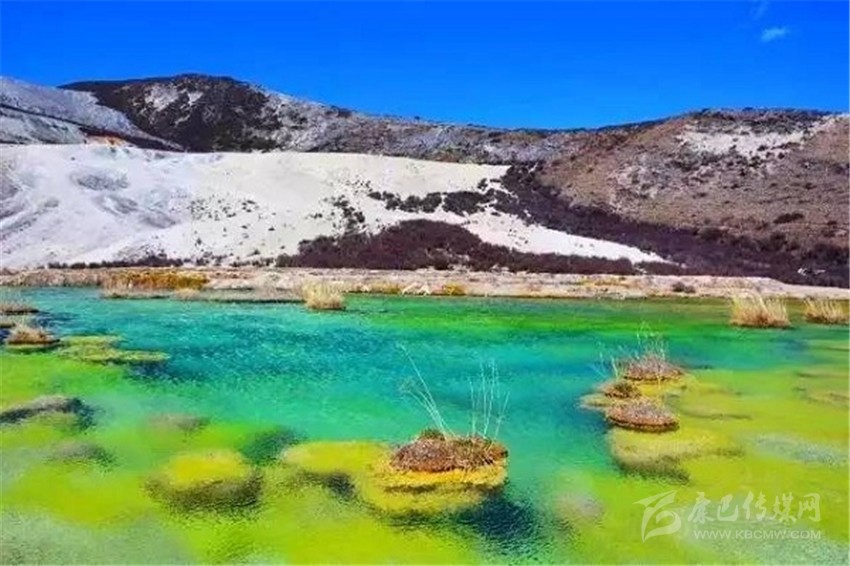 泉華灘海拔約4000米,屬于高山河谷草甸地貌。東南面就是貢嘎山,這里是觀看“蜀山之王”的絕佳位置。它因一種含有大量化學(xué)物質(zhì)的泉水在地表產(chǎn)生化學(xué)沉淀而成,從另一個山頭傾斜下來大片的白色鈣化土,延伸到谷底后便變化出四層五彩的鈣化池。每個階地上有十幾個大小不同、形態(tài)各異的五色彩池,水深40-70厘米,彩池里水草相依,石花點點,疑為瑤池降臨人間!