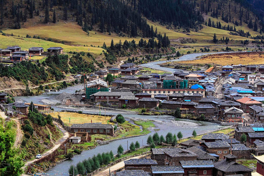 石板藏寨保留著原始的藏式民居文化,一宅一院,一磚一瓦的建造都是居民用石板蓋成,錯落有致、古樸大氣。這里地勢平坦、神山環(huán)抱,開闊的草地上河水蜿蜒流過,百花盛開五彩斑斕,美景恍若天堂,藏房令人向往。