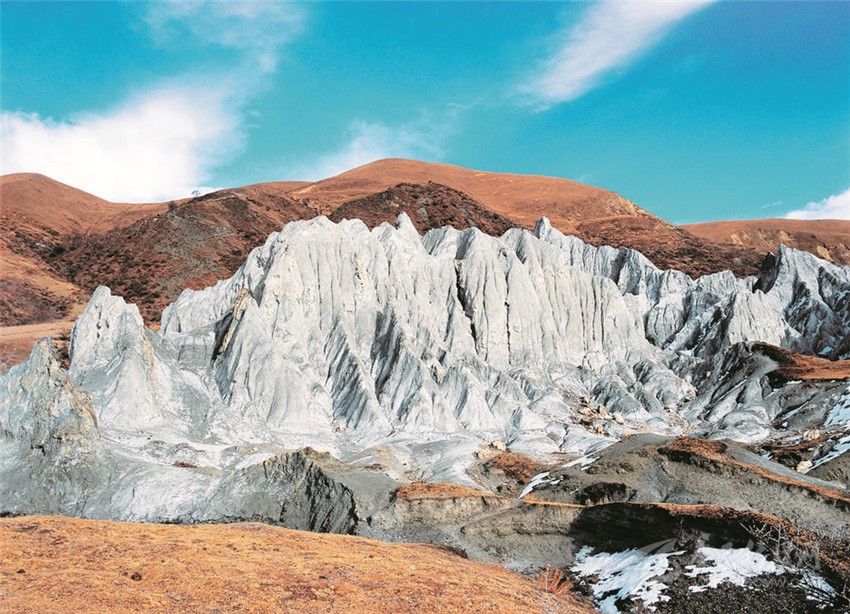 質(zhì)地較軟的糜棱巖石林,它的生命也是有限的,在長時間的風(fēng)霜雪雨中,終有一天它也將分崩離析、成泥作土。在大自然面前,它既壯觀又脆弱!它就像矗立于川藏線上的驚嘆號,不僅蘊藏著鮮水河斷裂帶的諸多信息,又以孤傲的身軀、奇異之美詮釋著大自然的神秘力量。
