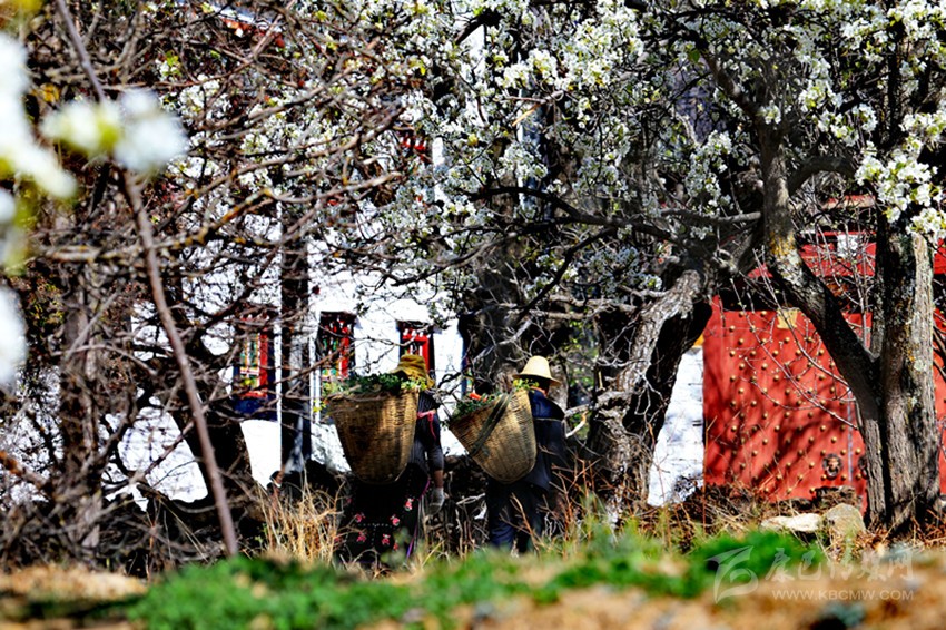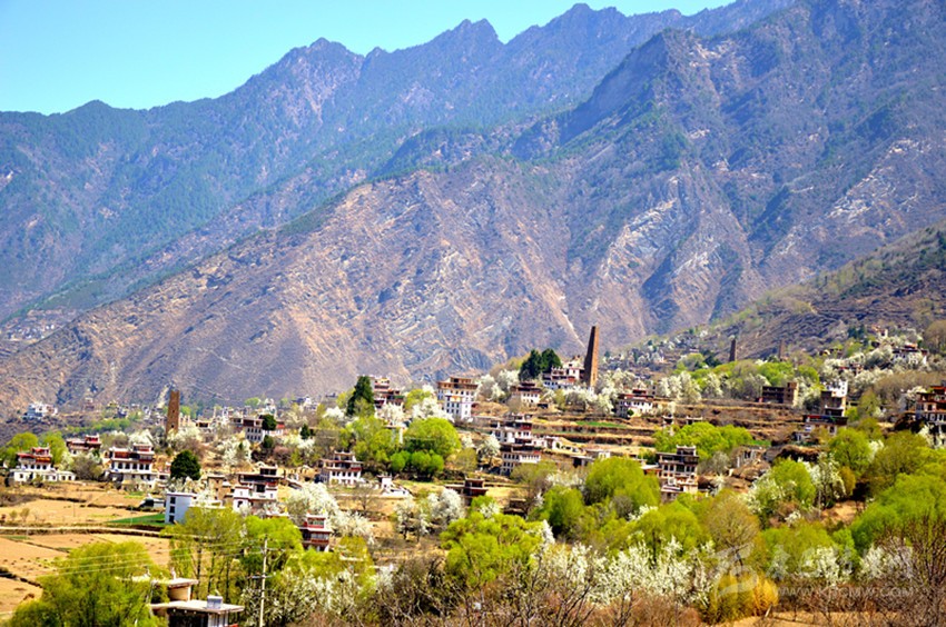 藏寨的梨花,并非成片的生長(zhǎng)在一起,它們散落在村民的田間地頭和房前屋后,老干虬枝,滄桑感十足,仿佛是一個(gè)個(gè)“時(shí)間老人”,守望著藏寨的幸福變遷。