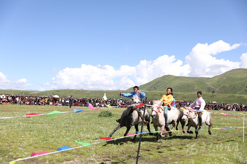 馬尼干戈鎮(zhèn)全境橫貫國(guó)道317線,是德格典型的純牧業(yè)鄉(xiāng)鎮(zhèn),轄區(qū)內(nèi)地廣人稀,草場(chǎng)豐富,有著十分豐富的牧俗文化,“西天瑤池”玉隆拉措也坐落于此。每年的7月底8月初舉行的賽馬節(jié),是當(dāng)?shù)刈顬槁≈氐膫鹘y(tǒng)民族節(jié)日之一。在雪域高原上綠草如茵、各類鮮花爭(zhēng)相斗艷的最美時(shí)節(jié),牧民們會(huì)身著華麗的藏裝,自發(fā)聚集在一片開(kāi)闊的草場(chǎng)上,搭帳篷、唱歌跳舞,并開(kāi)展賽馬、賽牦牛、賽跑和馬技表演、趣味游戲等民俗民間活動(dòng),增進(jìn)相互之間的感情,促進(jìn)鄰里和睦。