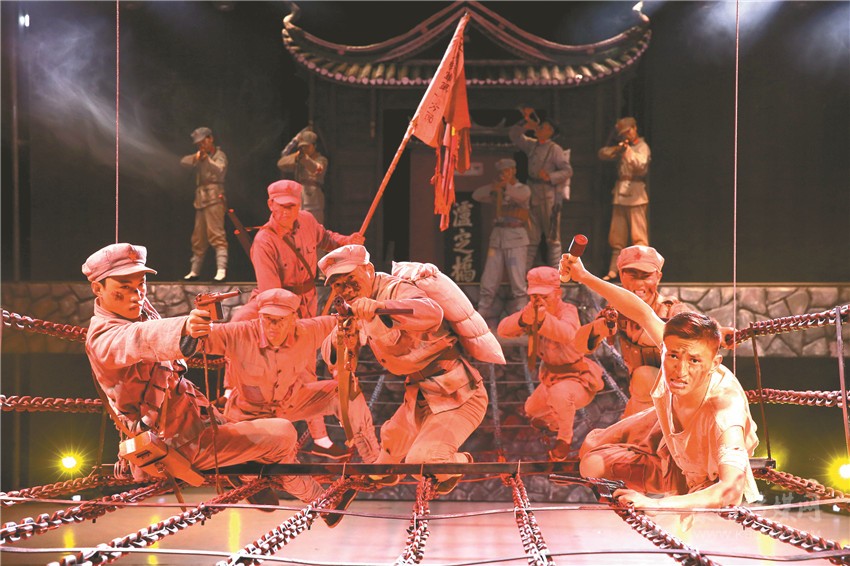 本網(wǎng)訊 在身著紅軍服、打著“火把”的戰(zhàn)士的引領(lǐng)下,觀眾緩緩而行,在經(jīng)歷一場(chǎng)激烈的戰(zhàn)斗后,大家走過(guò)銷(xiāo)煙彌漫的戰(zhàn)場(chǎng),來(lái)到實(shí)景劇場(chǎng),以一位“親歷者”的身份“穿越”至歷史的場(chǎng)景。幽深的河谷、洶涌的波濤、兇殘的敵人、英勇的戰(zhàn)士、激烈的戰(zhàn)斗……隨著劇情的展開(kāi),讓人親臨其境84年前那場(chǎng)驚天動(dòng)地的重要戰(zhàn)役——《飛奪瀘定橋》。