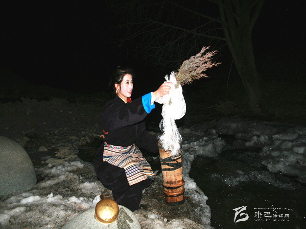 在除夕這天,家里的婦女會把庭院,房屋重新打掃一遍。把垃圾再清理一次。因為習(xí)俗認(rèn)為,初一掃地和除垃圾會把一年的財運和好運都掃走。這天,大人小孩還要忙著洗頭、洗澡,搞好個人清潔衛(wèi)生。而除夕之夜最重要的一個儀式是“搶頭水”。(新年的第一桶水—晨星水)。傳說,晨星水是人間最吉祥的水。它可以獻(xiàn)神,可以潔身,可以祛病,洗滌一切污垢和不祥,帶來平安和幸福。從除夕夜十二時開始,一個個懷抱柏樹枝和哈達(dá)的姑娘或小伙子們披著繁星,爭先恐后地去背晨星水。第一個先到河邊的要熏燃桑煙,并用哈達(dá)繞上柏樹枝蘸水向空中拋灑三次,并把柏樹枝放在河邊。背回的晨星水首先要供奉佛祖。然后才可以用來燒茶、洗漱。而家里的五谷斗上則盛滿了糌粑、炒青稞粒、人參果等食品,上插青稞穗,也有在八寶碗里用糌粑和五彩酥油做成“切巴”,供奉在佛堂里。這一切都是為了祈禱來年風(fēng)調(diào)雨順、人畜兩旺、喜獲豐收。除夕夜,在正房桌子上還要擺上各式油炸果子、牛肉坨坨、糖果以及青稞美酒、飲料等等美味佳肴,開始迎接新年的到來。