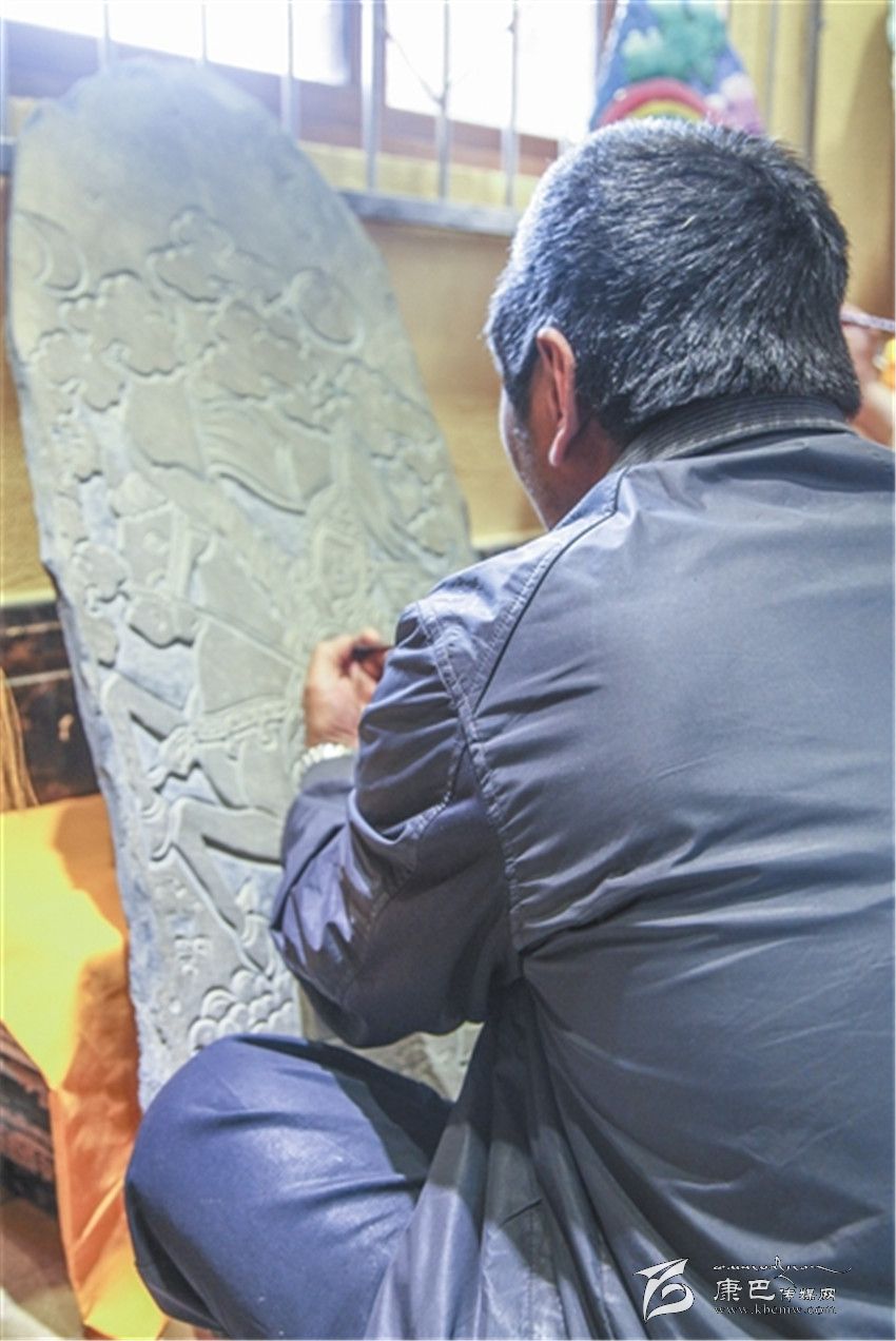 “刻一幅一米高、八十公分寬的作品,一般用時在一個月以上。”所彭接過巴德的話說,在格薩爾彩繪石刻中,最理想的尺寸就是一米高、八十公分寬。但由于各種原因,現(xiàn)在很不容易找到這么大、又適合石刻的石板。此外,也有一些人采用機(jī)器進(jìn)行刻制,但這就失去了藝術(shù)的本來價值。