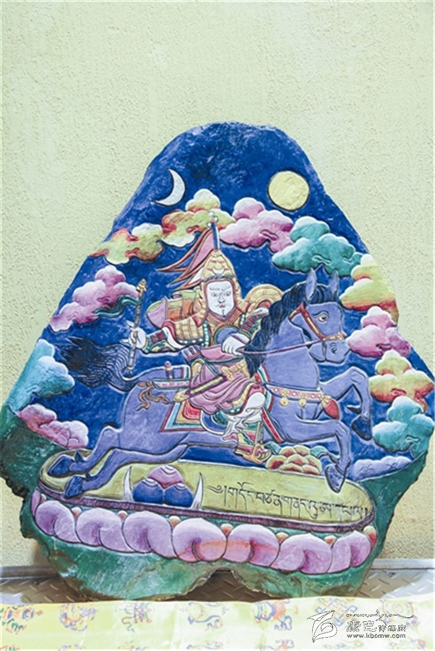 據(jù)了解,格薩爾彩繪石刻是藏族民間美術(shù)中的一門創(chuàng)新藝術(shù),它不僅是格薩爾文化的一種新的傳承方式,也填補(bǔ)了格薩爾文化在藏族石刻中的空白。格薩爾彩繪石刻刀法精細(xì),取材考究,在采用鑿刻、直刻、斜刻刀法的同時,注重磨刻、磨劃技術(shù)效果,使石刻畫構(gòu)圖和諧。在石刻畫上采用了彩繪工藝,這樣既增加了畫面視覺的藝術(shù)感和光澤度,又可以起到保護(hù)作用。