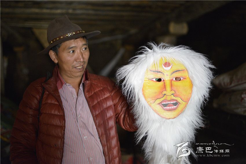 午飯后,洛絨丹巴帶我到離家不遠的一個小院,推開底樓嘎吱作響的木門,借助外面的光亮,看見有幾個巨大的鐵皮箱。洛絨丹巴打開一口箱子,不想里面整齊地放著各種戲服;第二口箱子是頭飾,唐朝文成公主的、清朝皇帝的。這些服裝和頭飾多是模仿電視電影,或者加上想象自己制作的,個別是外地方買回的。最具特色是第三口箱子,用牛皮制作的各種面具、表情十分夸張,有和善的、猙獰的、威風(fēng)的,神情各異。面具的顏色各種各樣,白色、黑色、黃色、紅色等。眼睛和嘴巴處挖了窟窿,有的還在面具外圍綴了一圈羊毛。洛絨丹巴指點著各種顏色的面具介紹:白色代表純潔、紅色代表威嚴、黃色代表吉祥;巫女則半黑半白,象征其兩面三刀的性格;青面獠牙代表妖魔。說起這些他如數(shù)家珍。