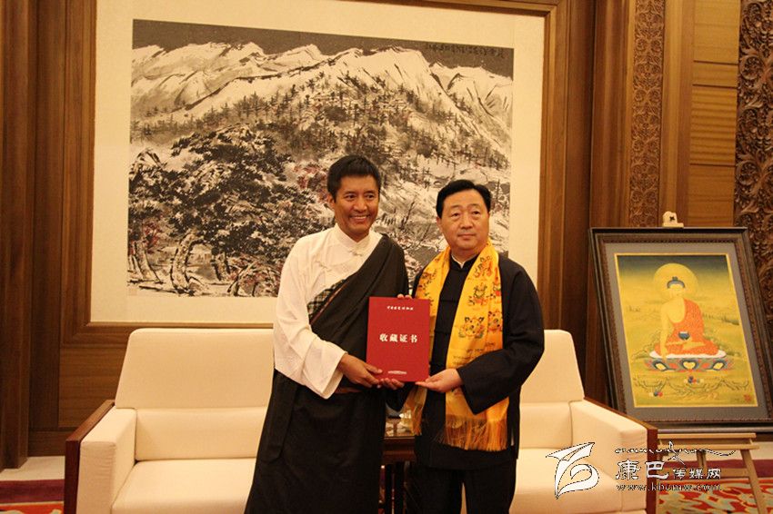 產(chǎn)業(yè)化發(fā)展的探索之路,不僅圓了年敘·多吉頓珠的“文化產(chǎn)業(yè)夢(mèng)”,而且也讓他實(shí)現(xiàn)了一次華麗轉(zhuǎn)身,成為一名有擔(dān)當(dāng)?shù)钠髽I(yè)家。今年9月5日至15日,由中華文化發(fā)展促進(jìn)會(huì)、西藏自治區(qū)文化廳、西藏自治區(qū)文學(xué)藝術(shù)界聯(lián)合會(huì)、西藏自治區(qū)文化產(chǎn)業(yè)協(xié)會(huì)主辦,西藏崗地文化產(chǎn)業(yè)集團(tuán)、西藏拉姆拉綽唐卡畫院承辦的“西藏唐卡藝術(shù)——多吉頓珠、丁噶唐卡作品展“在北京中國(guó)國(guó)家博物館舉行。他和丁嘎先生現(xiàn)場(chǎng)向國(guó)家博物館捐贈(zèng)了《釋迦牟尼》、《五方度母》、《綠度母》和《觀音》四幅精品,這是國(guó)家博物館首次收藏多派唐卡和嘎瑪嘎智畫派唐卡,填補(bǔ)了國(guó)家博物館館藏嘎瑪嘎止畫派和多派唐卡的空白。國(guó)家博物館館長(zhǎng)呂章申先生熱情為兩位大師頒發(fā)了收藏證書并激動(dòng)地說:“多吉頓珠先生和丁嘎先生捐贈(zèng)的精品力作,豐富了中國(guó)國(guó)家博物館的館藏,更好地弘揚(yáng)了西藏文化藝術(shù)。國(guó)家博物館有責(zé)任把最好的藝術(shù)品收藏起來,留存于后世。”