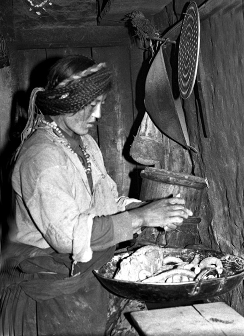 再就是有腌制酸菜的好手—魚通婦女。魚通女,多是“大腳丫頭”,高大壯實,堪稱“女漢子”,且善良賢淑、憨厚能干,里里外外拿得起放得下,看不到一點“窈窕淑女”的影子。所以早年康定地方流行這樣的“禪話”:“大風塆的風,瓦斯溝的蔥,要討婆娘到魚通”。高高山上的魚通女,“任你溜溜的求喲!”。