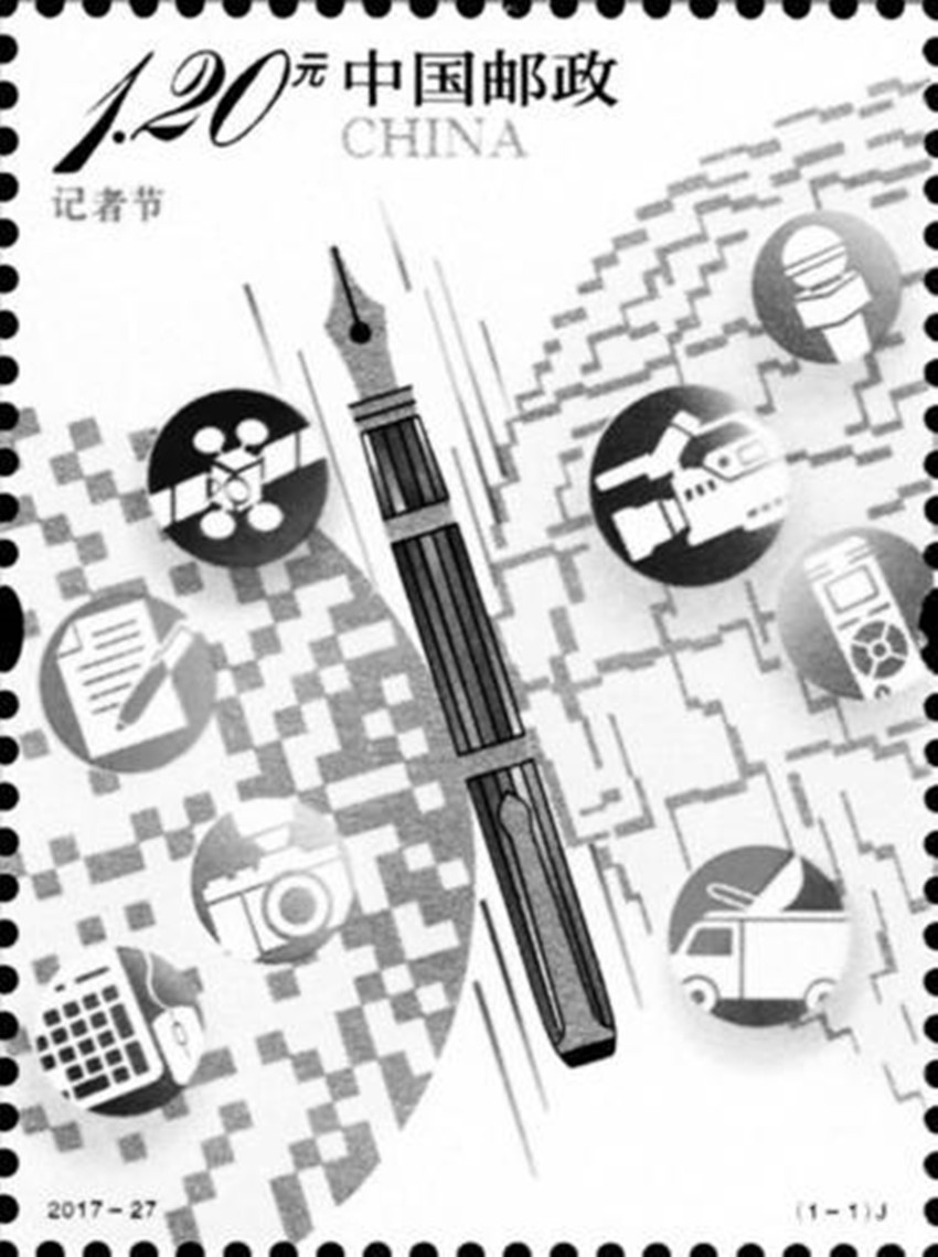 為紀(jì)念第18個(gè)記者節(jié)。中國(guó)郵政定于2017年11月8日發(fā)行《記者節(jié)》紀(jì)念郵票一套1枚。郵票圖案采用了具有現(xiàn)代感的構(gòu)成手法及色彩表達(dá)方式。畫面中的鋼筆象征了記者秉持弘揚(yáng)民族精神、維護(hù)國(guó)家利益和社會(huì)責(zé)任的專業(yè)精神和自信風(fēng)范。兩側(cè)的線條及方點(diǎn)構(gòu)成的兩個(gè)圓形圖案分別隱喻地球和現(xiàn)代網(wǎng)絡(luò)體系,表示在新媒體時(shí)代,新聞傳播媒介所呈現(xiàn)出的多元化、全球化的發(fā)展態(tài)勢(shì)。畫面中麥克風(fēng)、攝像機(jī)、錄音筆等形式各異的采編設(shè)備圖標(biāo),結(jié)合衛(wèi)星及地面發(fā)射站等元素,突出了當(dāng)代記者巨大的社會(huì)影響力。同時(shí),鋼筆和兩側(cè)的圓形圖案共同組成了一只振翅飛翔的蝴蝶形象,喻意了記者追求至善至美,在探訪報(bào)道中擔(dān)負(fù)著傳播先進(jìn)文化,引領(lǐng)和維護(hù)和諧社會(huì),推動(dòng)人類文明的崇高使命和社會(huì)責(zé)任。