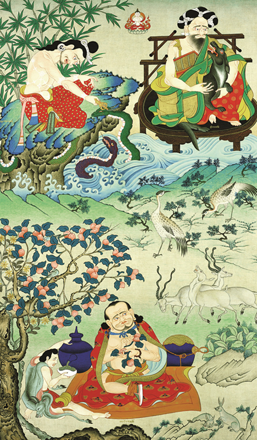 而從外部來看,元朝開始,西藏正式納入中國(guó)版圖,中原漢地的繪畫和西藏唐卡也大大增加了融匯交流的可能性。明朝延續(xù)了元朝對(duì)西藏的權(quán)力控制。政治關(guān)系日益穩(wěn)固,漢藏關(guān)系愈發(fā)融洽,文化交流也日漸繁盛。隨著漢地羅漢畫和青綠山水畫的技法大量進(jìn)入西藏。于是唐卡繪畫從十五世紀(jì)開始逐漸弱化印度、尼泊爾的影響,主動(dòng)學(xué)習(xí)、借鑒漢地的繪畫藝術(shù)。這是一個(gè)巨大的美學(xué)沖擊,它直接助攻了西藏唐卡本土化的進(jìn)程。