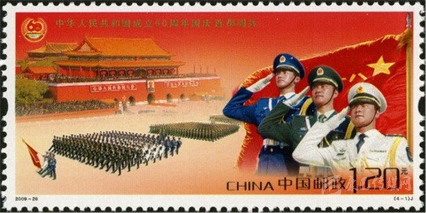 2009年10月1日,中國郵政發(fā)行的《中華人民共和國成立60周年國慶首都閱兵》紀(jì)念郵票一套4枚。其中第1枚“徒步方隊”(圖6),圖案為中國人民解放軍三軍儀仗隊執(zhí)旗手和護(hù)旗手在軍旗下行軍禮。