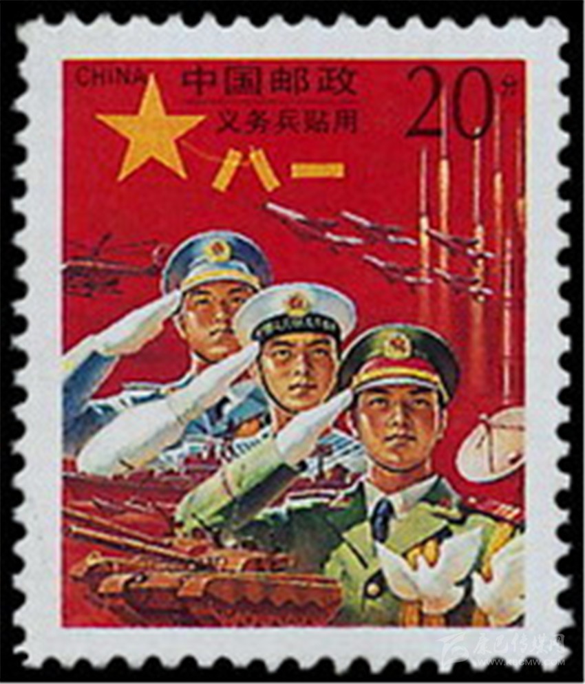 1995年8月1日,原郵電部試發(fā)行一套“義務(wù)兵專用”郵票一套1枚(圖5),票名為“神圣的使命”,圖案以紅光四射的“八一”軍旗為背景,以現(xiàn)代化的飛機(jī)、坦克、火箭和象征和平的白鴿為襯托,畫面是威武的陸海空三軍,顯示我軍鋼鐵長城般功無不克、戰(zhàn)無不勝的精神風(fēng)貌。