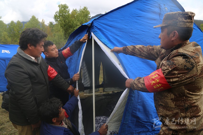 應(yīng)急救援人員在安置點(diǎn)搭建帳篷。