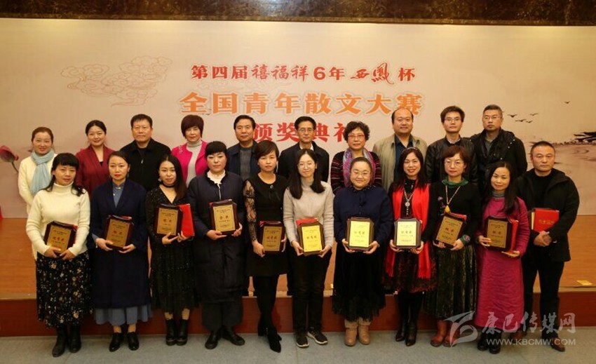 典禮在進行最后的儀式,一群師范學院上臺領受了本屆青年散文大賽獲獎作品的合集《青春放歌》,這也是大賽堅持了四年的傳統(tǒng)。陜西禧福祥品牌運營有限公司董事長助理王子童代表董事長王延安宣布本屆大賽落幕,與此同時,第五屆大賽正式啟動,并更名為“華語青年散文獎”,征集對象將面向所有華語散文青年作家。