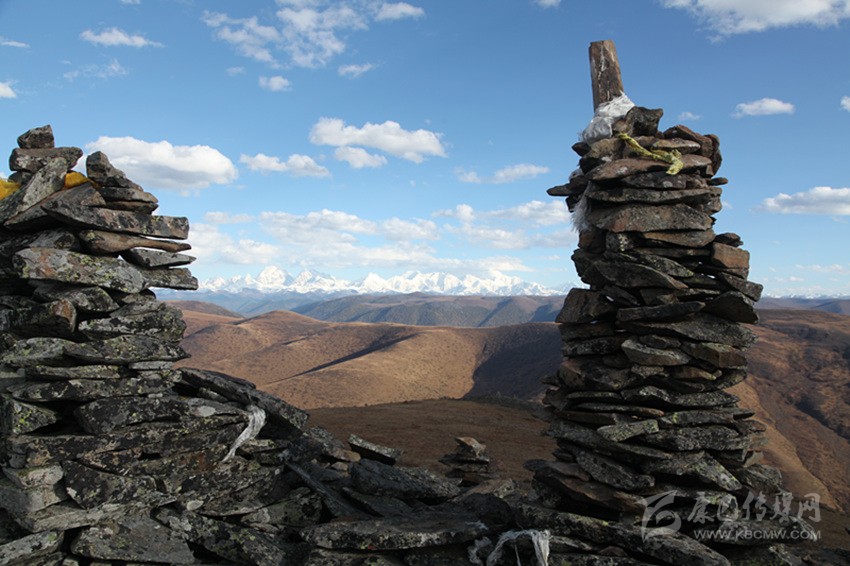 在高爾寺山頂,一個標(biāo)注有海拔4412米的藍(lán)底標(biāo)志牌顯得有些孤單,與之相伴的,除了呼嘯的大風(fēng)外,還有隨風(fēng)飄動的嘛呢旗。頭頂?shù)乃{(lán)天沒有一朵云彩,遠(yuǎn)處的雪山格外潔白耀眼,曾經(jīng)繁茂的小草已經(jīng)枯黃了,幾朵不知名的野花在寒風(fēng)中書寫著最后的輝煌,仿佛在向人們宣誓著它的存在。