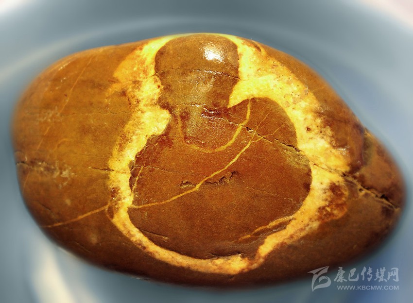 作為一個無組織的業(yè)余獨行淘石者,經(jīng)過數(shù)年的摸、淘、琢磨,我悟出:發(fā)掘趣石最重要的是要獨具慧眼慧心,會讀石紋。是否讀懂石紋,決定著一塊石頭是頑石還是奇石的命運。這是一件很難的事,不僅要運用你獨特的審美視角,還得發(fā)揮你豐富的想象。有時,為了讀懂一些石紋,我會抱著這塊石頭如考古學(xué)家般仔細(xì)琢磨,從正面、側(cè)面,再到背面,又從左邊旋到右邊,或者上下顛倒來打量……一番冥思苦想,會意會神,直到靈感涌起、慧心頓悟,尤如洞天石扉訇然中開,眼前的頑石拙巖,頃刻便化為藝術(shù)珍寶,令我欣喜若狂。正如悉達多說:“這塊石頭是石頭,它也是動物,也是神,也是佛,我敬重它和熱愛它,并非因為它有朝一日會變成這個或那個,而是因為它早就是這一切,一直是這一切?!背錆M靈性的石頭在你和美妙的自然間搭起了一座通靈的橋梁。淘得趣石,還需緣分。就像人與人的相遇講究緣分,遇到心儀的石頭也講究緣分天助。有年春節(jié),我與父親去河邊轉(zhuǎn)游,面對涪江寬闊的石灘,我的淘石癮又犯了。但出門前答應(yīng)過父親,這次只逛不撿石頭。我知道老爸心疼我一個女子大過年的撿石頭。河邊冷,且石頭扛起來很重,手與衣服都會弄得很臟。我邊陪父親漫走閑聊,眼睛卻止不住往河灘逡巡,仍希望無意中淘到中意的石頭。走著走著,我發(fā)現(xiàn)有一群鳥歡唱著從遠(yuǎn)處一個石堆飛起,冥冥中感覺那里有寶貝,遂向老爸懇求,過去看一下就回來。來到那個石堆中心,幾乎不費什么功夫,就看到一塊橢圓形石頭上有著一個自帶金色佛光圈的如來佛半身像。我怔住了,有點不敢相信如此幸運,蹲在那里久久打量。老爸隨后趕過來,看到佛像石,連連贊嘆了好幾句“太神奇了”。然后,他毫不猶豫地就幫我把石頭搬起來就走?;氐郊抑?,如獲至寶的我,趕緊清洗石頭,在清水的滋潤下,佛像的輪廓更加清晰。頸上的佛珠、袈裟線也分明,細(xì)看令人叫絕的這竟是一尊三面佛:正面、左側(cè)向、右側(cè)向均是佛。而在此石背面,也清晰出現(xiàn)了一個草書的“吉”字,真令人喜出望外。吉佛石,就這樣神奇地走進了我的生活,讓我相信一切緣分都是可遇不可求的。