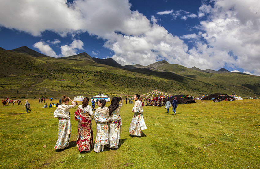 一片翡翠般的碧湖鑲嵌在谷地中央。公主梳妝的寶鏡,將美人、美景、美的念想都映在水里。九灣十八拐的“俄米曲”(牛奶河)是谷地和牛羊的母親。一溝豐盛的水草,滋潤了多少木雅兒女!木雅花宮、花海尋蹤,公主嘉姆尊的身影隨處可見。
