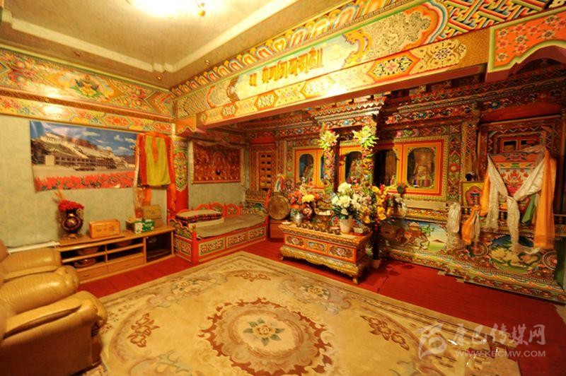 藏族居室一般分臥室、客廳、經(jīng)堂和廚房等部分。室內(nèi)陳設與裝飾如藏式建筑學者葉啟燊所言:“主次分明,重點突出。主室較為復雜而樸素,經(jīng)堂偏于華麗而清幽,其余各室均較簡單。室內(nèi)都不施粉刷,但有個別的經(jīng)堂作雕刻裝飾;土司和喇嘛上層的經(jīng)堂則會作油漆的彩畫?!辈貐^(qū)不論是農(nóng)牧民住宅還是貴族上層府邸都有供佛的設施,經(jīng)堂屬于凈地,是專門供奉神佛的,因此,一般不作他用;主室是藏族住宅中最重要的一個房間,也是功能最多的房間,其中有生活、睡眠、飲食等所需的爐灶、壁櫥、壁架、矮桌、火盆等。這些藏式家具的布置安放,早已形成一定之規(guī)。