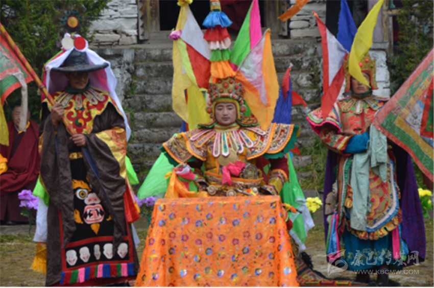 思路還是回到戲劇問題上來,在我以往欣賞的藏戲,其演出場所都設(shè)在露天,演員和觀眾在同一平臺(tái)的草地上,有時(shí)在平臺(tái)四周有山坡,那便是觀眾最好的看戲處。不過,從高處往低處看,效果還是不及平視的效果好。表演藏戲的舞臺(tái)在草地中央,觀眾圍著中央草地形成一個(gè)半包圍圈,演出幾乎沒有布景,即便有,也是簡單的一些桌椅、祭臺(tái)之類的簡單道具。在演出中,一個(gè)演員身著各類色彩鮮艷的帽、旗及其盔甲服裝等大于人體體型的飾物,這樣做的目的顯然是為了增強(qiáng)演出的鮮明性,尤其演員穿著厚底高靴,體型龐大,頭戴面具,嗓音洪亮,動(dòng)作凝重而富有節(jié)奏,使整個(gè)演出富有較強(qiáng)的穿透力和沉重感。藏戲的音樂也比較簡單,主音節(jié)奏依靠長號(hào)、大鼓、鈸等,曲目轉(zhuǎn)換時(shí)則多以笛子演奏,間或插入海螺聲、嗩吶聲等。整個(gè)藏戲的故事情節(jié)則是依靠舞蹈和合唱來漸次推進(jìn)的。藏戲作為祖國文化大家庭中的成員之一,自然有著自己獨(dú)特的特點(diǎn),有著屬于自身的文化藝術(shù)和生活土壤的傳承因子。藏戲誕生在一個(gè)特殊的環(huán)境里,它既在風(fēng)格、形態(tài)、特征和韻致上包含著與其他戲劇相似的共通性,同時(shí),它又蘊(yùn)涵著與眾不同的自身的內(nèi)涵特征??傊貞蛟凇案?、舞、劇、技等方面的有機(jī)結(jié)合,虛擬寫意的表現(xiàn)型戲劇,程式化表演手段,自由靈活的演出時(shí)空概念,??????它又具有與古希臘戲劇很類似的貫穿始終的講解人和伴唱伴舞隊(duì),面具表演,三面以至四面觀眾的廣場演出,一部分生活化寫實(shí)表演,演出時(shí)空的間接固定場景,史詩式講唱文學(xué)的劇本結(jié)構(gòu)和說唱藝術(shù)的演出格式等特殊之處。”【劉志群《中國藏戲史》4頁】因此,在藏戲的諸多元素中,我們可以看到顯著的特征,這就是明顯的原始巫文化和原始苯教文化的痕跡,無論是在藏戲的臺(tái)詞、面具和服飾中,還是在藏戲的音樂、樂器和表演形式上,不難看出藏戲的這一本土特征,至于與其他戲劇流派的類似之處,我以為,一方面是戲劇本身固有特征的表現(xiàn),另一方面或許是一種合理吸納所致。