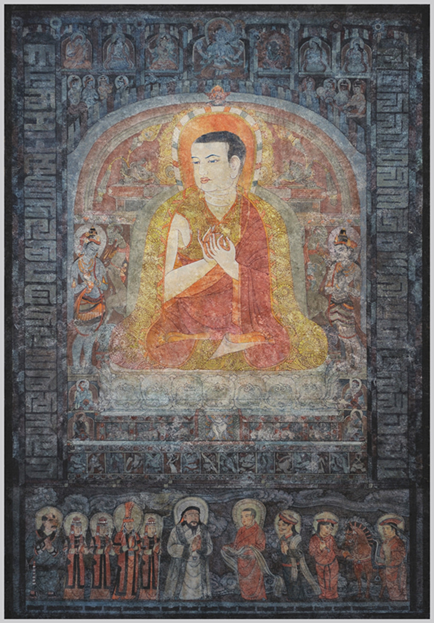從“三怙主”往兩邊發(fā)展,分別是早期“薩迦五祖”中的前“四祖”:初祖貢噶寧布(1092--1158年);二祖索南孜摩(1142--1182年),三祖扎巴堅(jiān)贊(1147--1216年),四祖貢噶堅(jiān)贊(1180--1251年),即“薩迦班智達(dá)”。而薩迦第五祖就是畫面正中的八思巴(1235--1280年)。根據(jù)藏文史料,薩迦五祖中的前三祖稱為“白衣三祖”,因?yàn)樗麄兌紱](méi)有正式出家受比丘戒,而是身著俗衣以居士身份自居;后二祖稱為“紅衣二祖”,因?yàn)樗麄z正式出家為僧,受過(guò)比丘戒,身著紅色袈裟。1253年夏天,忽必烈的軍隊(duì)到達(dá)六盤山一帶,請(qǐng)八思巴到軍營(yíng)一敘,雖然有的史書記載之前八思巴就與忽必烈見(jiàn)過(guò)面,但這次是八思巴第一次以薩迦教主身份正式會(huì)見(jiàn)忽必烈。畫面的下方表現(xiàn)的就是“六盤山相會(huì)”的歷史場(chǎng)景。畫面右邊是八思巴一行列隊(duì)迎接的場(chǎng)面。中間著紅色吐蕃服裝者即是八思巴,他手捧哈達(dá)、神情莊嚴(yán)的給忽必烈獻(xiàn)上哈達(dá),紅色吐蕃衣服暗示他當(dāng)時(shí)還未受比丘戒的“紅衣”身份;在他身后哈達(dá)搭肩、雙手合十者為其弟恰那多吉,藏青色衣服暗示他的俗人身份;隊(duì)列后面是兩位服侍教主的僧侶,他們頭戴吐蕃氈帽、牽馬負(fù)笈等候在一旁。左邊是蒙古王族的儀仗隊(duì)列,為首便是身著白色裘衣的忽必烈。其后是三個(gè)侍女簇?fù)碇牟毂赝蹂?,第一位侍女扶著代表皇族的華蓋,而淡青色華蓋說(shuō)明:忽必烈當(dāng)時(shí)尚未繼承蒙古大汗位。察必王妃和侍女皆穿著紅色的蒙古弘吉剌部落服裝,所不同的是王妃服飾比侍女服飾更顯尊貴和優(yōu)雅;隊(duì)伍的最后是一位穿著青衣、佩戴短刀的蒙古侍衛(wèi)。整個(gè)蒙古王族隊(duì)列面對(duì)將來(lái)的帝師八思巴,大家都謙遜、虔誠(chéng)、靜穆地雙手合十致意。忽必烈、察必王妃以及八思巴的形象是根據(jù)古代繪畫作品和文字描述而創(chuàng)作的,服飾、用具、民風(fēng)民俗也都經(jīng)過(guò)仔細(xì)的研究考證。畫面兩邊是用“八思巴文”的字母組成的紀(jì)念柱,彰顯八思巴創(chuàng)立“蒙古新字”的功勛。受忽必烈指派,八思巴借鑒藏文拼讀方式創(chuàng)制出由41個(gè)字母構(gòu)成的一種新文字,其語(yǔ)音拼讀均按蒙語(yǔ),又稱“八思巴蒙文”。八思巴向忽必烈呈獻(xiàn)蒙古新字后,忽必烈極為高興,并於1268年下詔,凡是詔書及各地方公文等均必須使用蒙古新字,在全國(guó)范圍內(nèi)推行這種新文字。