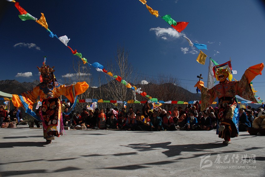 康巴藏傳佛教各派每年冬春都要舉行面具不同、內(nèi)容各異的跳神祭祀活動(dòng),規(guī)模最大的數(shù)德格縣更慶寺的普巴多吉——《金剛撅童子》跳神。這一活動(dòng)于藏歷每年元月中旬舉行,由僧人演出,連續(xù)兩天,是歷時(shí)十天的佛事活動(dòng)的組成部分。屆時(shí)群眾從四面八方絡(luò)繹而至,上萬人匯聚于大壩爭相觀看,場面十分壯觀。