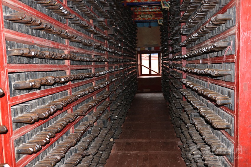 德格版《甘珠爾》經(jīng)版均為雙面刻版,每一塊經(jīng)版長64厘米,寬10厘米,厚3厘米,除去手柄10厘米,凈長54厘米。共有103函,1108種,版片33013塊。