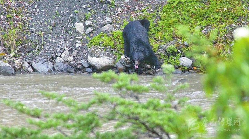 說完,陳廣磊才拿起相機(jī),拍了一分鐘,心想可能要去通知一下董磊,于是他往回走,結(jié)果在路上,就看見董磊扛著沉重的相機(jī),飛一般跑,“原來董老師也看見黑熊了,可惜黑熊跑不見了。后來我才知道,在野外發(fā)現(xiàn)黑熊是件極難得的事。”從陳廣磊拍的影像中,黑熊趴在岸邊,貪婪地喝著河水,要不是那粉紅色的舌頭,與周邊環(huán)境幾乎融為一體。