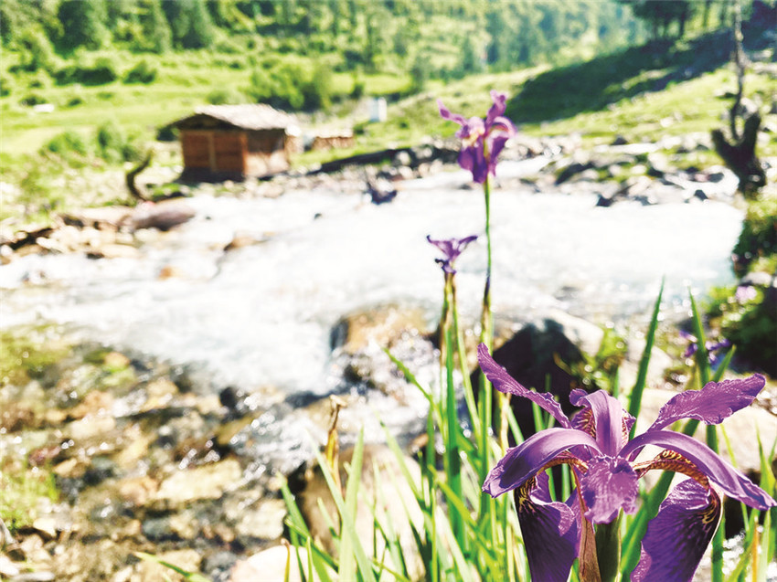 我走出木屋,朝著流動的水聲去梳洗。三兩只藍(lán)綠色的鳥兒立在插入溪水溝里的一截木槽上低頭飲水,抬頭鳴唱,見到人影,撲棱棱幾聲飛進(jìn)了不遠(yuǎn)處的一片淺樹叢里,沒了蹤跡。一層薄薄的白霧正從牧場后方皺褶起伏的山頂漫溢下來,湮沒了黛青色的山石、綠色的小杜鵑樹叢,接著湮沒了整個牧場,眼前一片空茫,耳邊只有溪水婉轉(zhuǎn)流向遠(yuǎn)處的聲音。我蹲下身,把手伸進(jìn)溪水里,由雪水融化的沁涼很快冷冽到了骨頭里,再往深處,觸摸到一個個光滑的圓石。浸泡久了,溪水開始變得柔軟溫暖起來,掬一捧洗臉,那清爽仿佛能使我一眼看開眼前的云霧,看清那些停立于山頂石礫之上的灰色獐子和樹叢深處悄然綻開的紫色貝母花,花瓣上星星點(diǎn)點(diǎn)的白是它與生俱來的喜色。