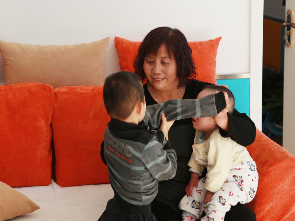 ??2017年11月3日,內(nèi)蒙古呼和浩特市兒童福利院里,“愛心媽媽”景鳳英抱著兩個孩子。新華社記者 王婧嬙 攝
